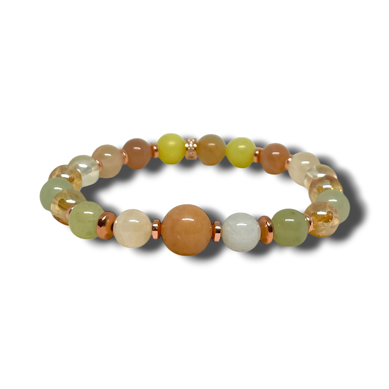 Az Ásványbarlang különleges Napfény Angyala karkötője prémium minőségű barna holdkő, lemon aurakvarc, jáde, arany aurakvarc és rosegold hematit ásványokból készült. Ez a karkötő a belső harmónia, érzelmi tisztaság, védelem és spirituális fény esszenciáját hordozza, hogy minden nap sugárzóbb és kiegyensúlyozottabb legyen viselője.