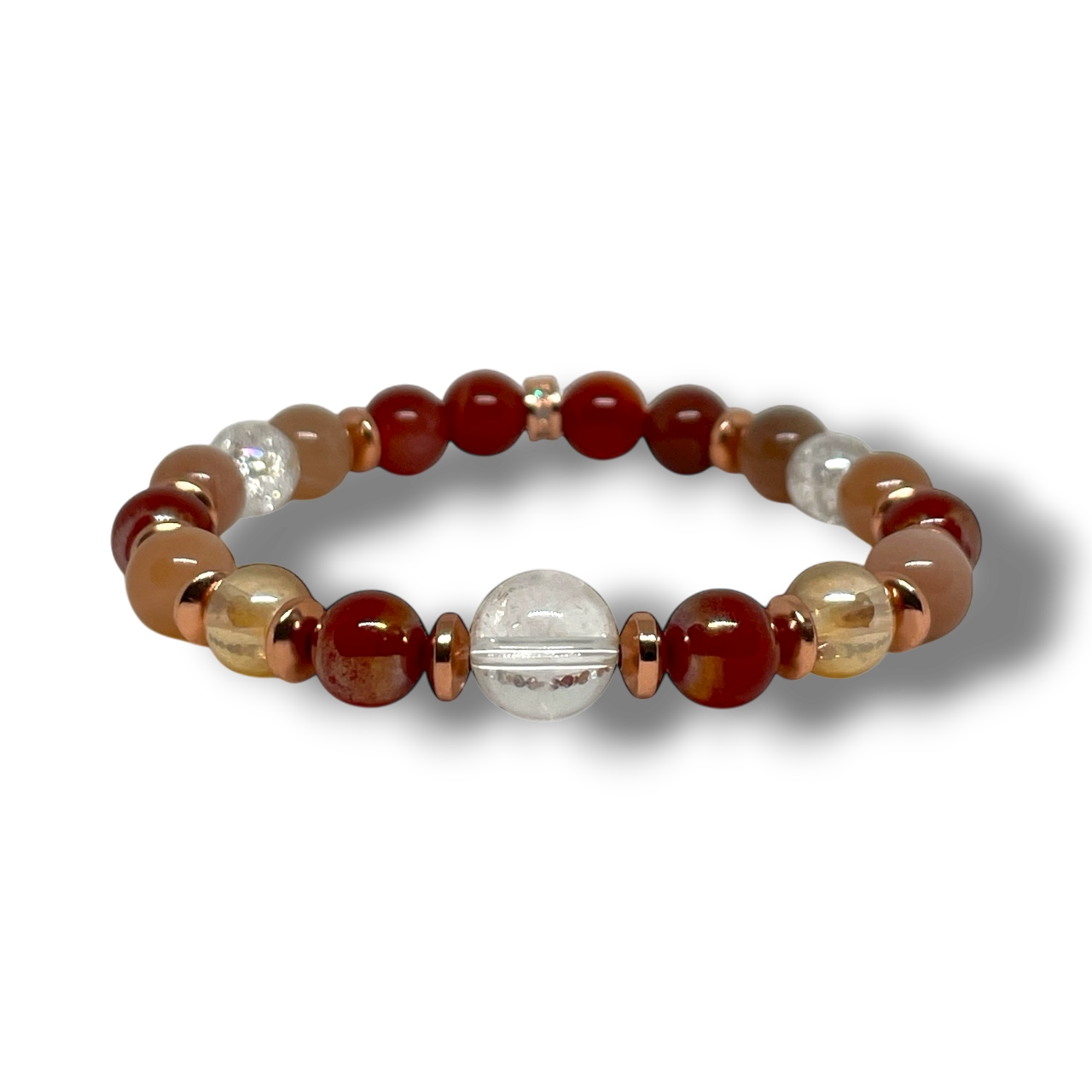 A hegyikristály energiája tisztaságot és erőteljes tisztító hatást ad, segítve az egyensúly és a fókusz megőrzését. A karneol életerőt, kreativitást és bátorságot hoz, támogató energiával erősítve meg az önbizalmat. Az arany aurakvarc szeretetteljes rezgése tisztítja az aurát és elősegíti a lelki békét. Az angyal aurakvarc magas rezgésű kő, amely spirituális védelmet és belső harmóniát nyújt. A barna holdkő segít az érzelmi stabilitásban, intuícióban és belső bölcsesség kialakításában. A rosegold hematit egyedi fényével harmonizálja a test és lélek energiáit, miközben védelmet biztosít.