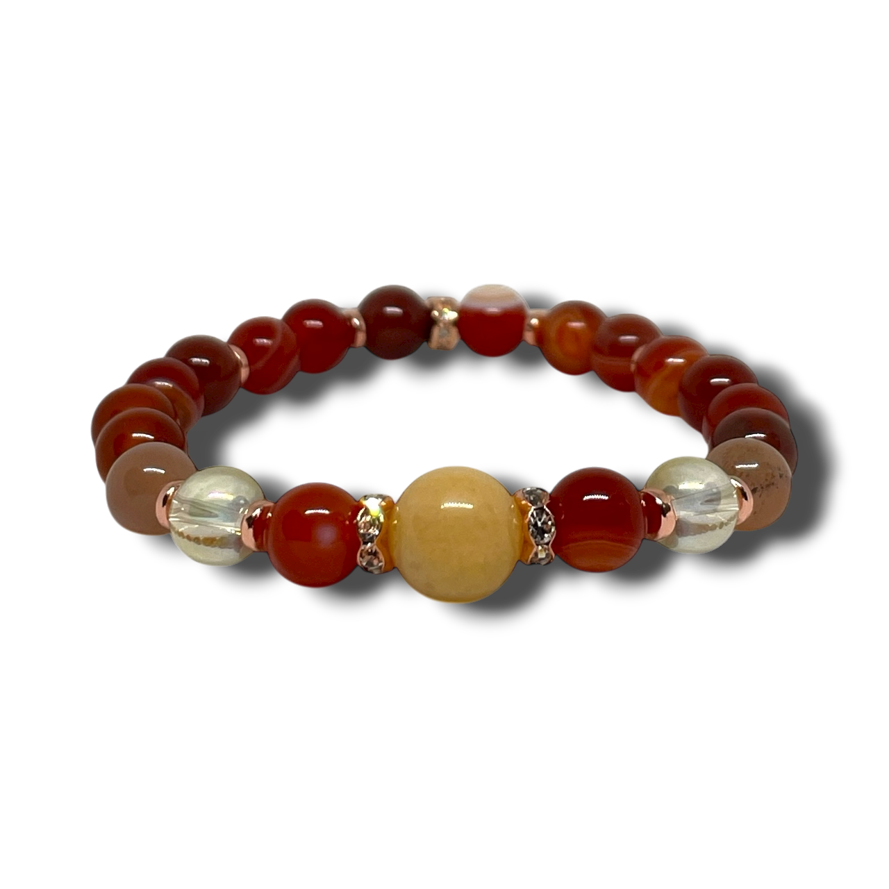 Az Ásványbarlang legújabb karkötője egy igazán különleges kombinációt kínál: a tisztaságot hordozó hegyikristály, az életerőt sugárzó karneol, a ragyogóan fénylő arany és angyal aura kvarc, a női energiákat erősítő barna holdkő, valamint a stílusos csillogású rosegold hematit egyesül benne. Ez a kézzel készült karkötő egyszerre modern, elegáns és spirituális kiegészítő.