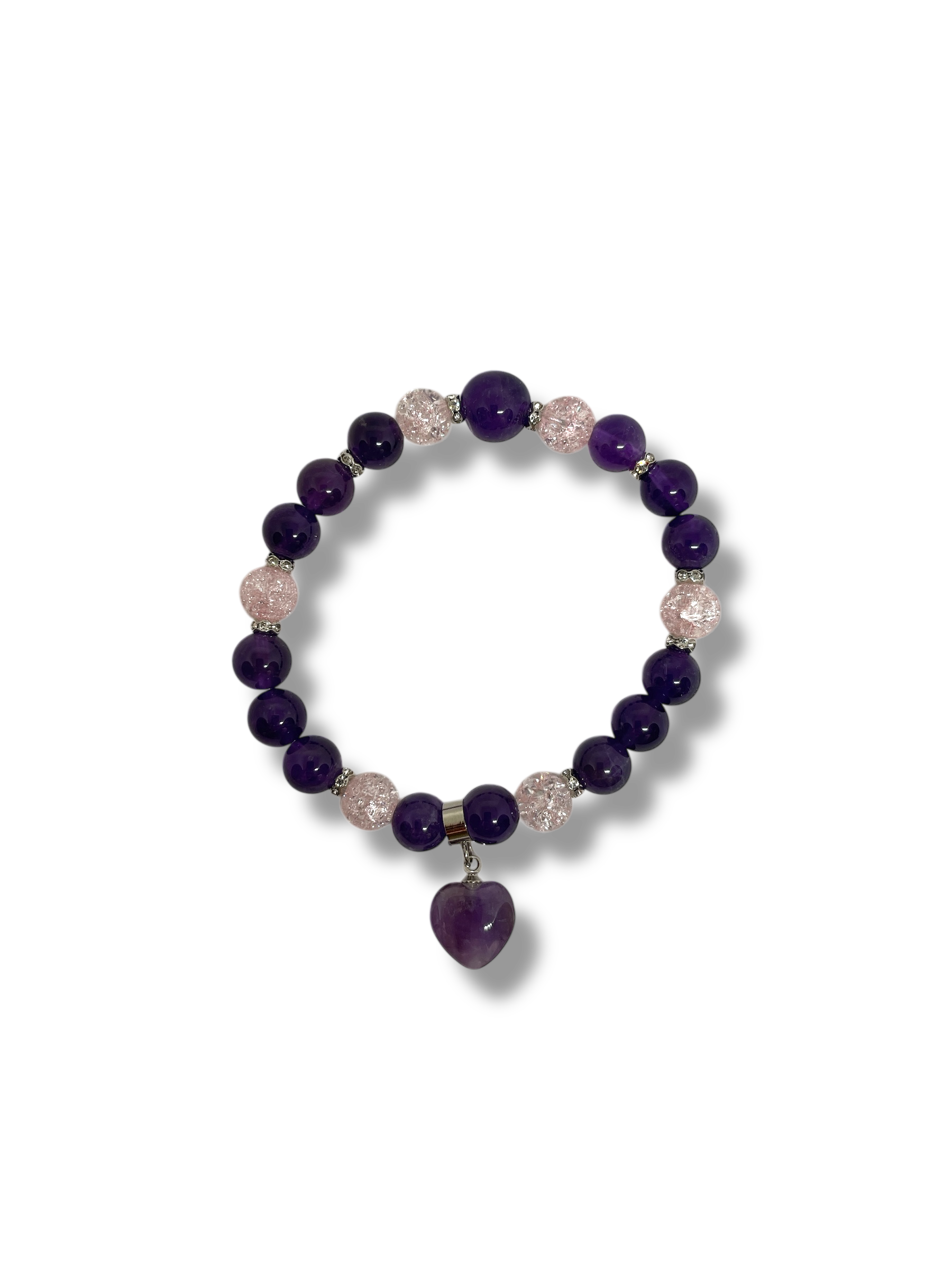 A Lelki Nyugalom karkötő prémium minőségű ametiszt, roppantott hegyikristály és ametiszt szív medál kombinációjából készült, amely támogatja a belső békét, a spirituális fejlődést és az intuíciót.
